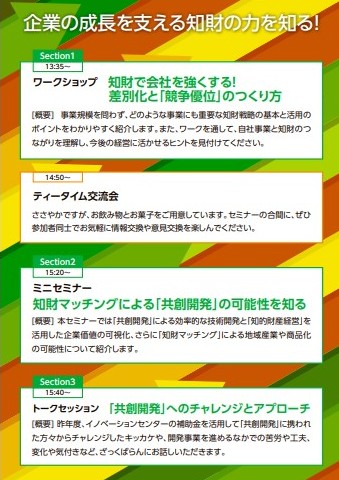 このセミナーでは、知財経営の基本と活用のポイント、知財マッチングによる「共創開発」の可能性、そして、当センターの補助金を活用して「共創開発」に取り組まれた関係者の『生の声』が聴ける機会となります。